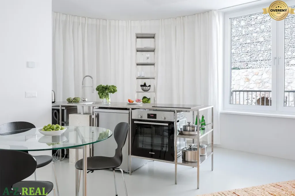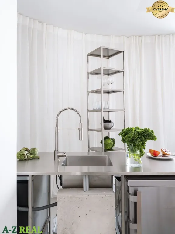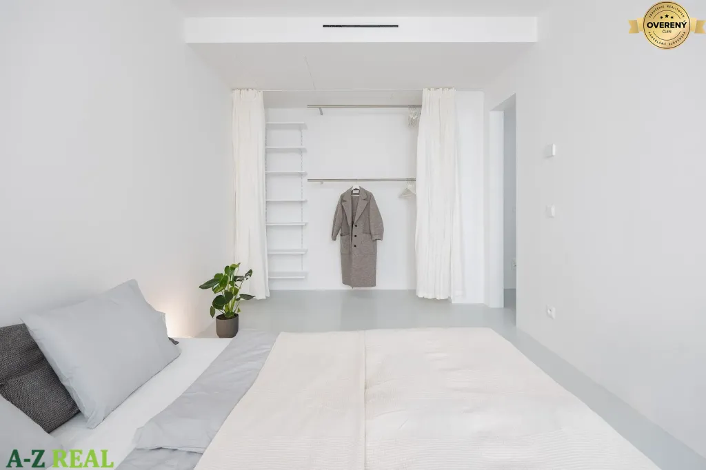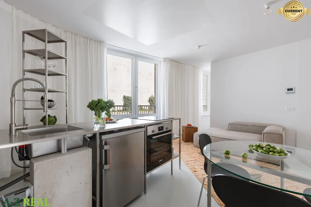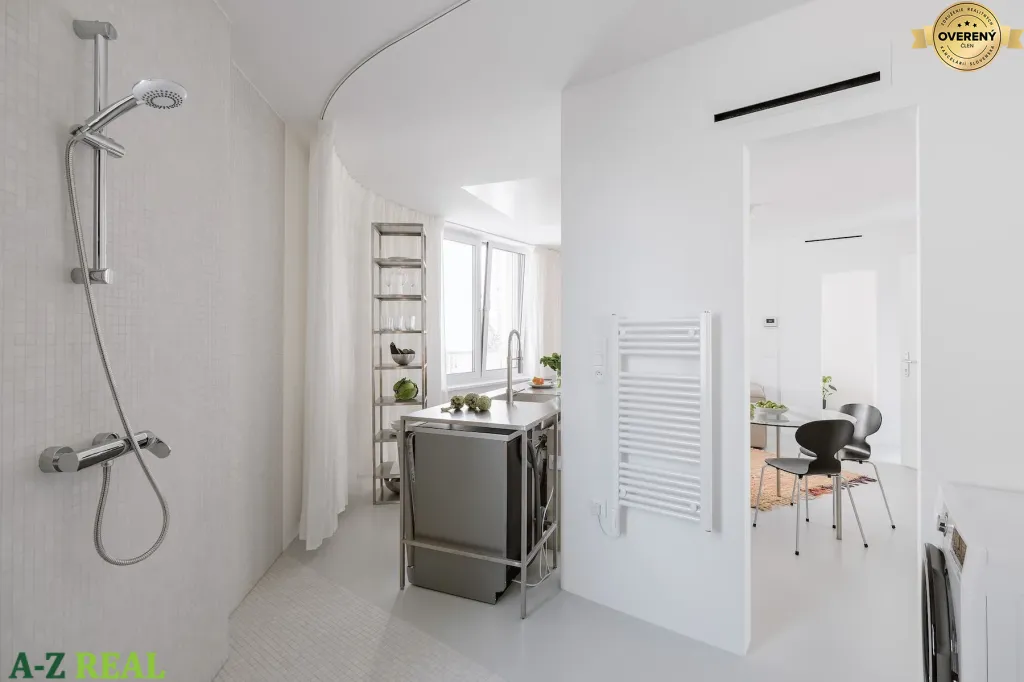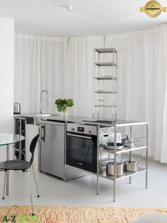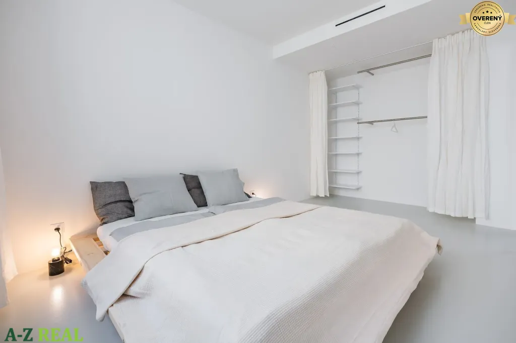 Dennú časť tvorí nerezová kuchyňa, inšpirovaná profesionálnymi riešeniami. Pôsobí čisto, minimalisticky a funkčne, pričom interiér jasne odlišuje od bežných developerských projektov. Spálňa je riešená vzdušne, disponuje otvoreným šatníkovým riešením v súlade s nadčasovým konceptom interiéru. Kúpeľňa nadväzuje na celkový architektonický koncept bytu, odkryté inštalačné stúpačky boli ponechané ako vedomý autorský zámer, ktorý priestoru dodáva industriálny akcent a zároveň vytvára priestor pre integrované policové riešenie s dizajnovým podsvietením.