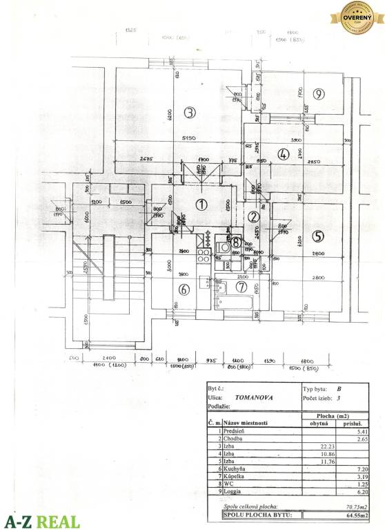 Ponúkame na predaj priestranný 3 izbový byt s celkovou výmerou 74,68 m² (byt 64,55 m² + zasklená loggia 6,2 m² + pivnica 3,93 m²), ktorý sa nachádza na 3. poschodí z 5 v zateplenom tehlovom dome bez výťahu.