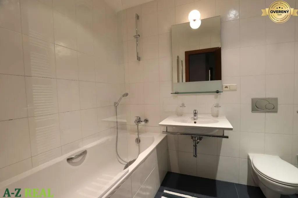V druhej časti bytu sa nachádza šatník a spálňa , odkiaľ je vstup na druhú terasu, kúpelňa s vaňou, umývadlom a WC. V celom byte je podlahové kúrenie,
