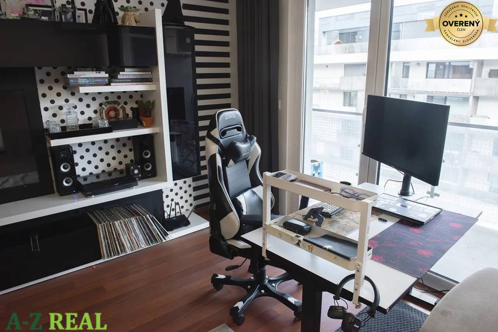 - Home office: V obývačke je vytvorený profesionálny pracovný kút (elektrický polohovací stôl, ergonomická stolička).