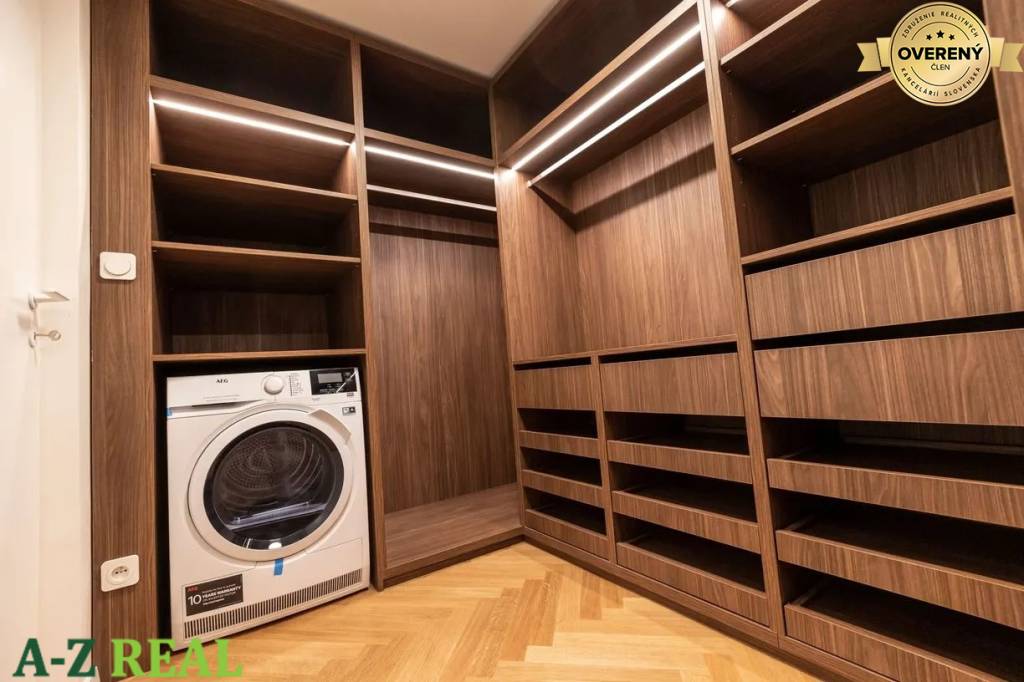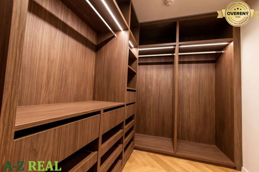 Zásadnou výhodou tohto bytu je rozmerný vstavaný drevený šatník, ktorý poskytuje dostatok úložného priestoru pre oblečenie aj osobné veci, pričom zachováva estetický charakter interiéru.