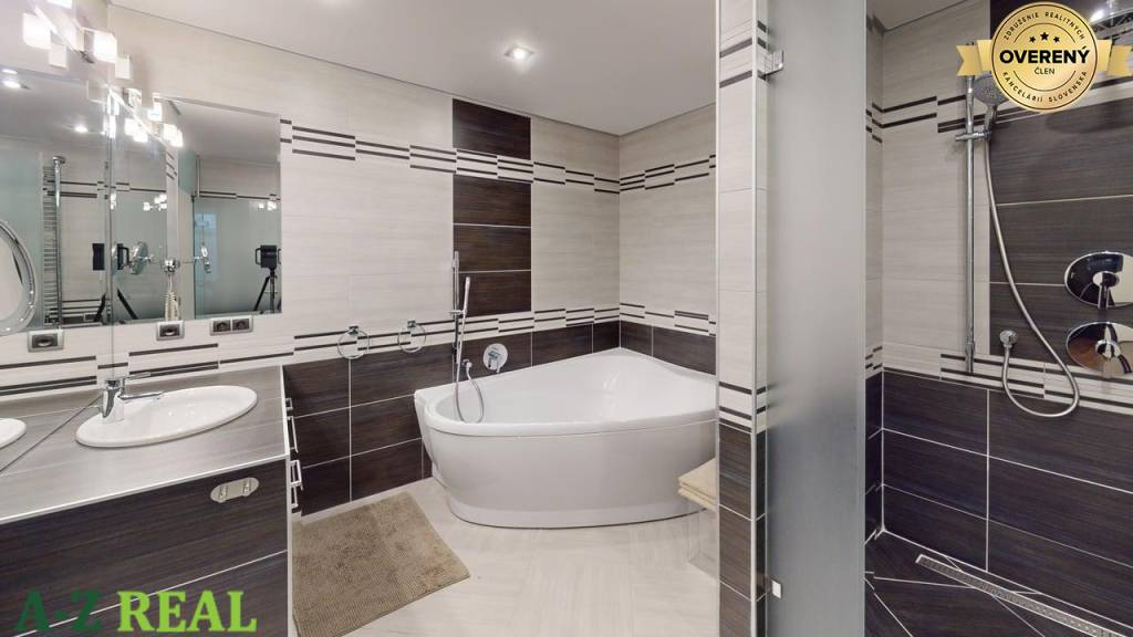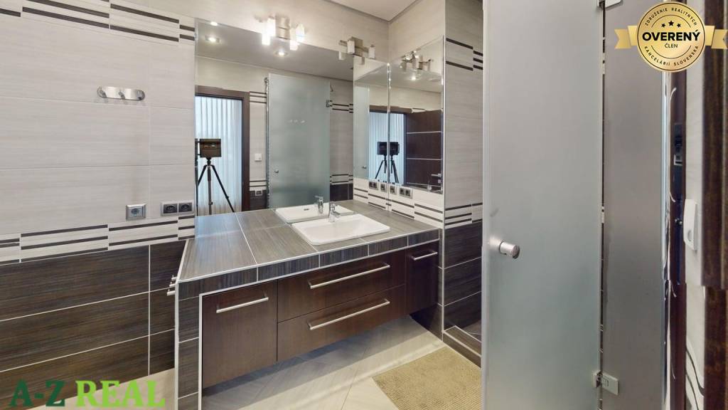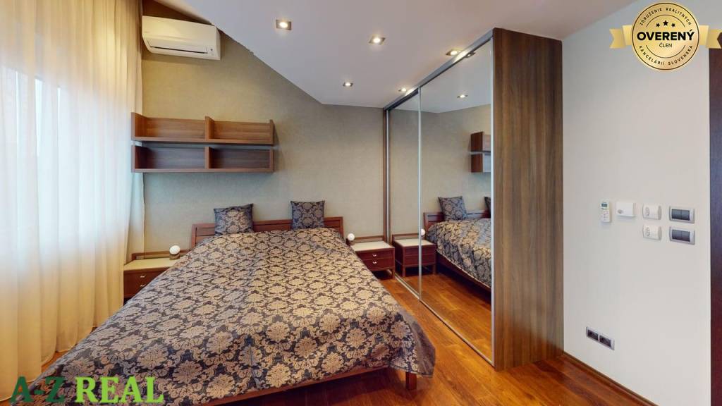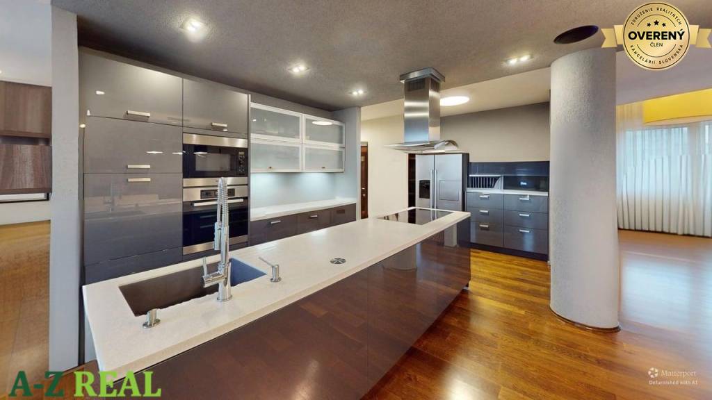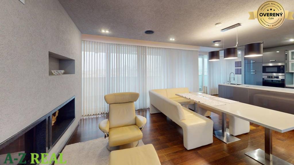 Je kompletne zariadený nábytkom a spotrebičmi (nemecká kuchynská linka ALNO, spotrebiče MIELE). Kamerový systém, vykurované a chladené stropy, vonkajšie žalúzie, alarm.