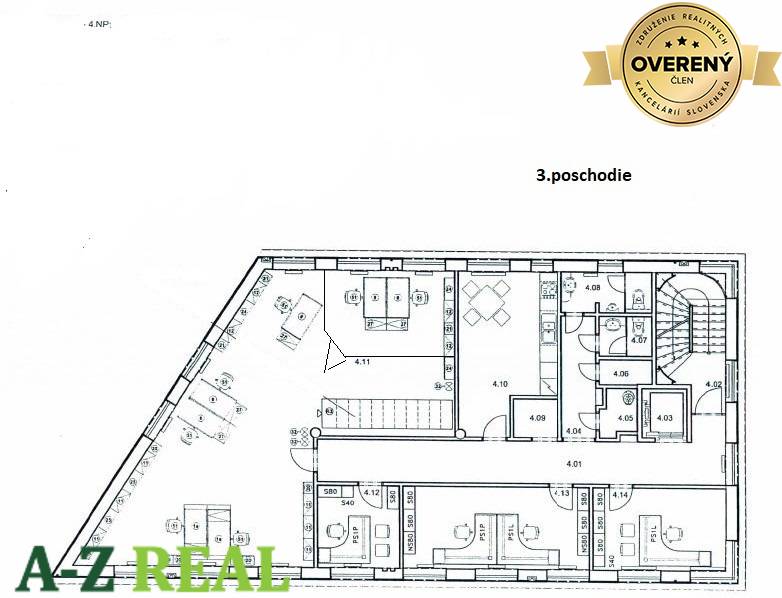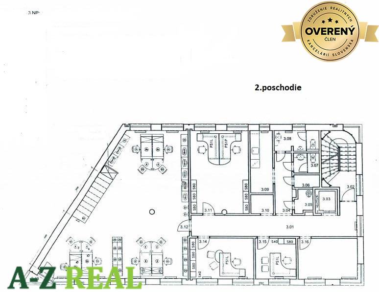 3. poschodie - 4. NP 196 m2 - 5 kancelárií, kuchynka, 2x sociálne zariadenie