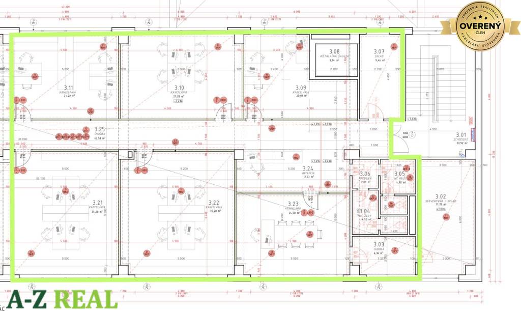 Voľné priestory o výmere 261,11 m2 na 3.NP (7 kancelárií, kuchynka, toalety)