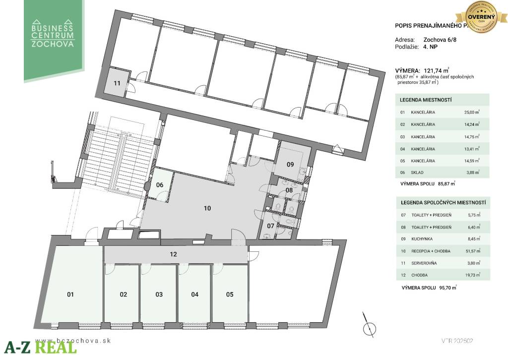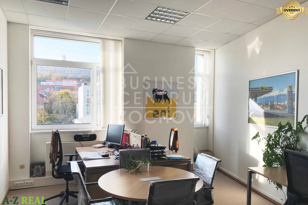 Kancelársky priestor sa skladá z 5 samostatných kancelárií, zo vstupných spoločných priestorov, kuchynky, toaliet, chodby a skladu.