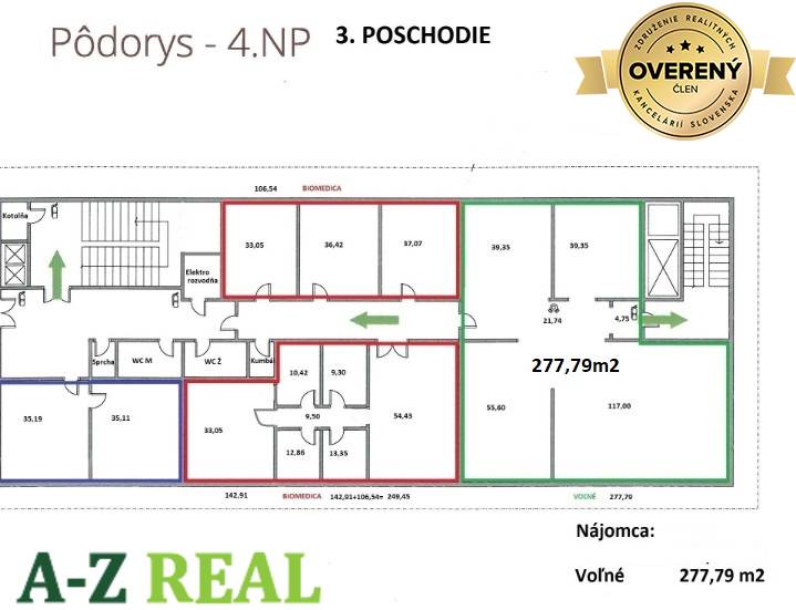3.poschode - samostatný celok 277,79 m2 - 2 kancelárie + open space,
