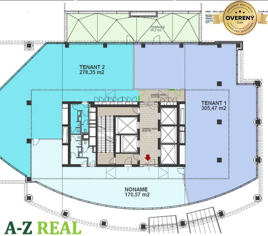 7. 13NP – 300,59 m2 celková plocha, (kancelárska plocha 278,47m2). Ide o priestor, ktorý vznikne oddelením časti poschodia a bude k dispozícii od 3/2020. Ide o zatiaľ nevybudovaný priestor v ktorom je možné spraviť dispozičné riešenie podľa požiadavky záujemcu a je okamžite k dispozícii.