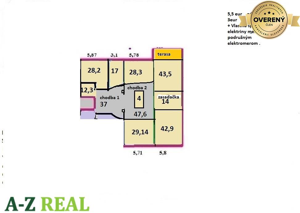 cena: 6,- EUR/m2/mesiac + energie a služby 3,- Eur/m2/mesiac + vlastná spotreba elektriky