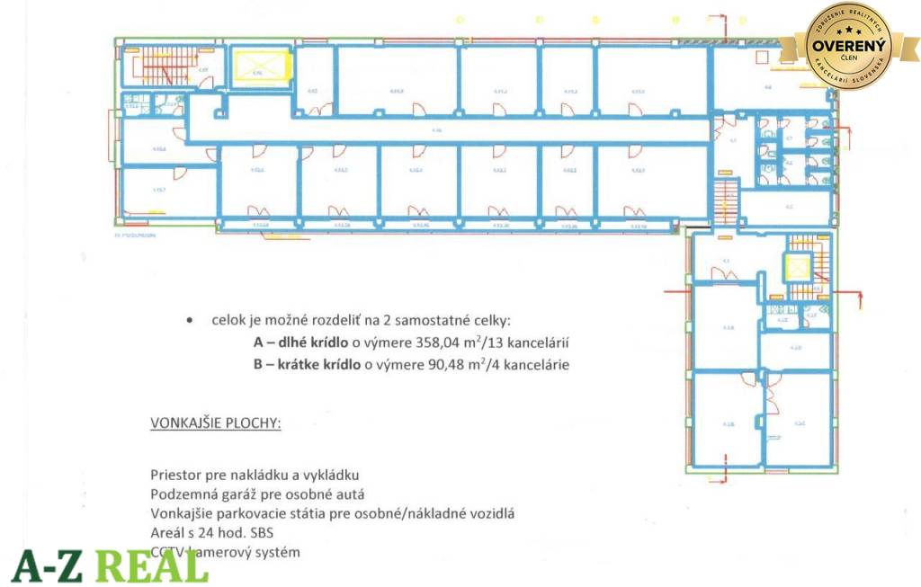3.poschodie s výťahom o výmere 448,52 m2 /možnosť rozdeliť na 358 m2 a 90,5 m2/ - 17 kancelárií, chodba, kuchynka, oddychová časť, sociálne zázemie