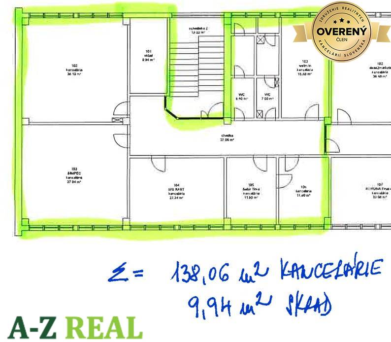 priestory sú rekonštruované - klimatizácia, plávajúce podlahy, na chodbe kuchynský kút, 2x soc. zar.