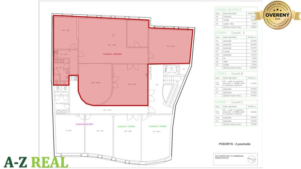 2.posch. o celkovej výmere cca 194,44m2 - 4 kancelárie, zasadačka, kuchynka, sociálne zázemie, chodba