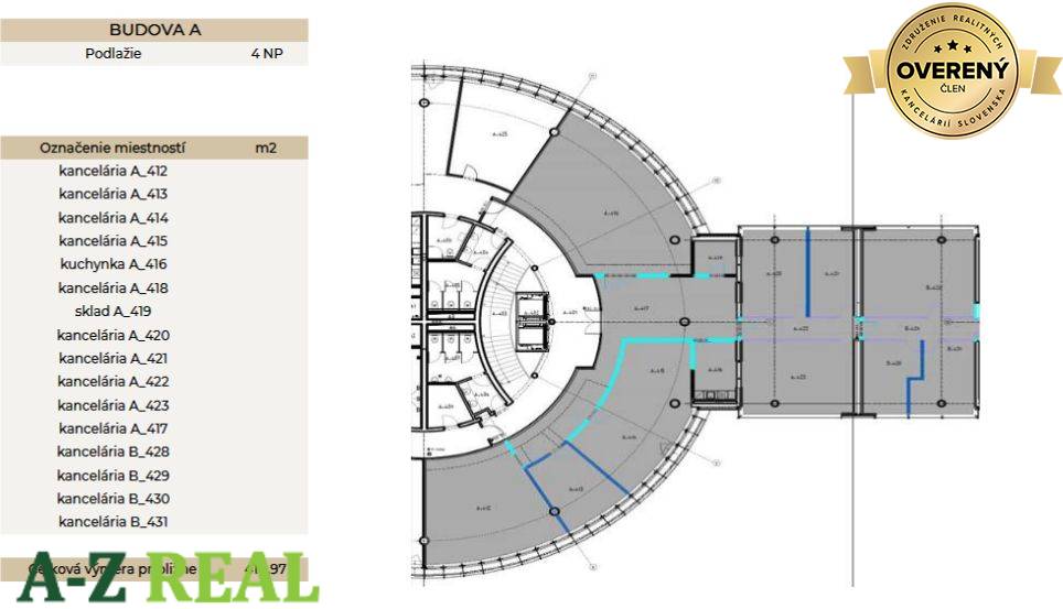 celok 410 m2 na 4.NP v budove A - samostatný celok kancelárie, open space, chodba,/kuchynka , soc. zar. spoločné na chodbe/