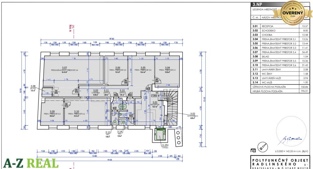 2. poschodie (3.NP) - 151 m2, kompletne zariadené - vstupná recepcia, 6 kancelárií, 2x kuchynka, 2x toalety