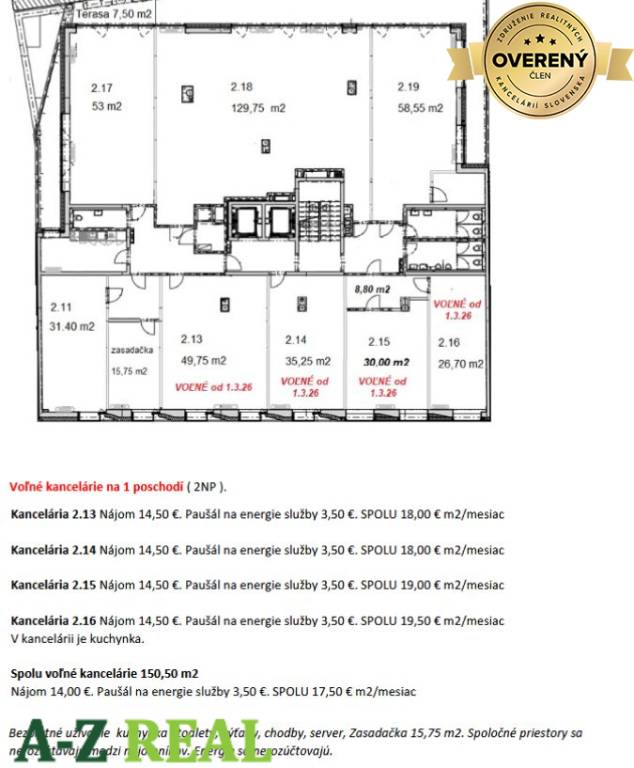 Nájom 14,50 €. Paušál na energie služby 3,50 €. SPOLU 18,00 € m2/mesiac