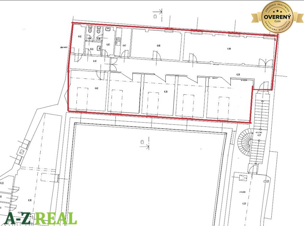 vchod C: 150 m2 - 3 poschodie /podkrovie - 5 kancelárií, recepcia, soc. zar., kuchynka, sprcha, bez výťahu
