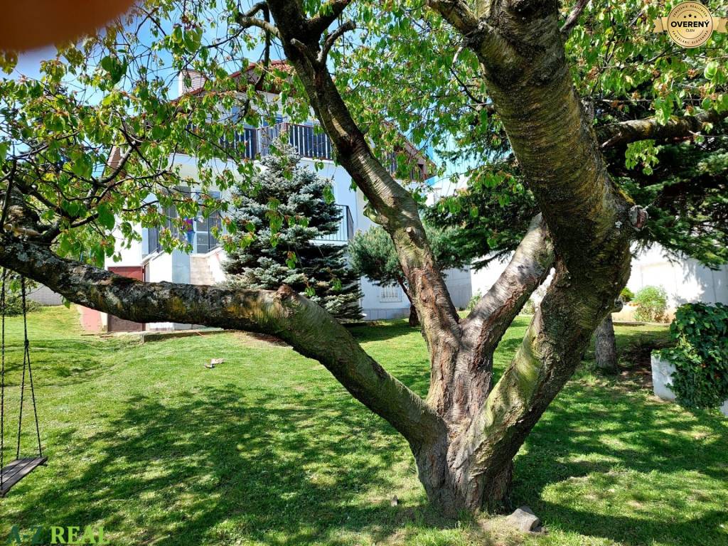 Dom je situovaný v záhrade s ihličnatými a ovocnými stromami.