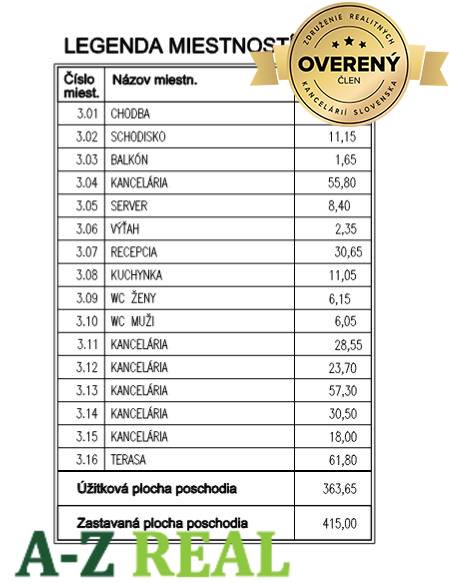 3. poschodie: 212 m2 - samostatný celok, vstupná recepcia, 5 kancelárií, kuchynka, 2x toalety, TERASA 62m2
