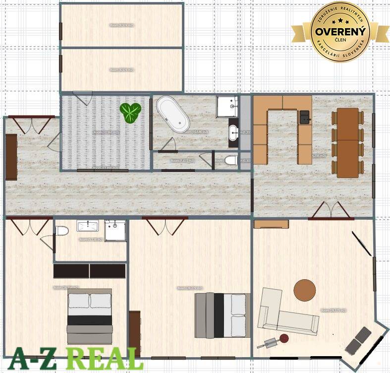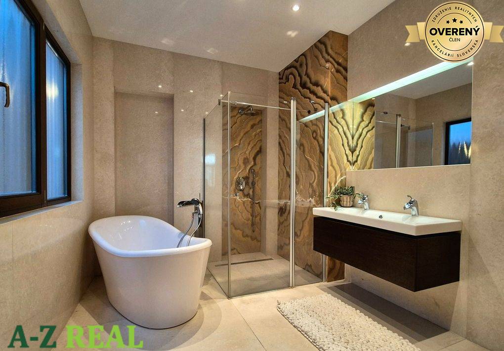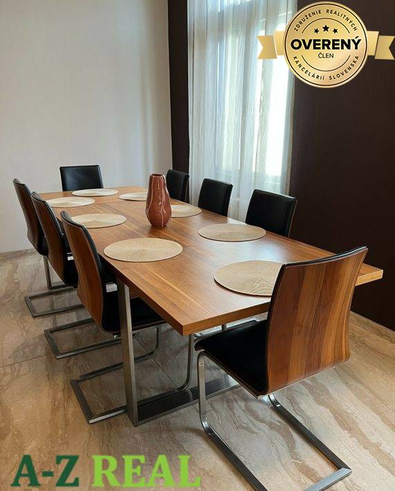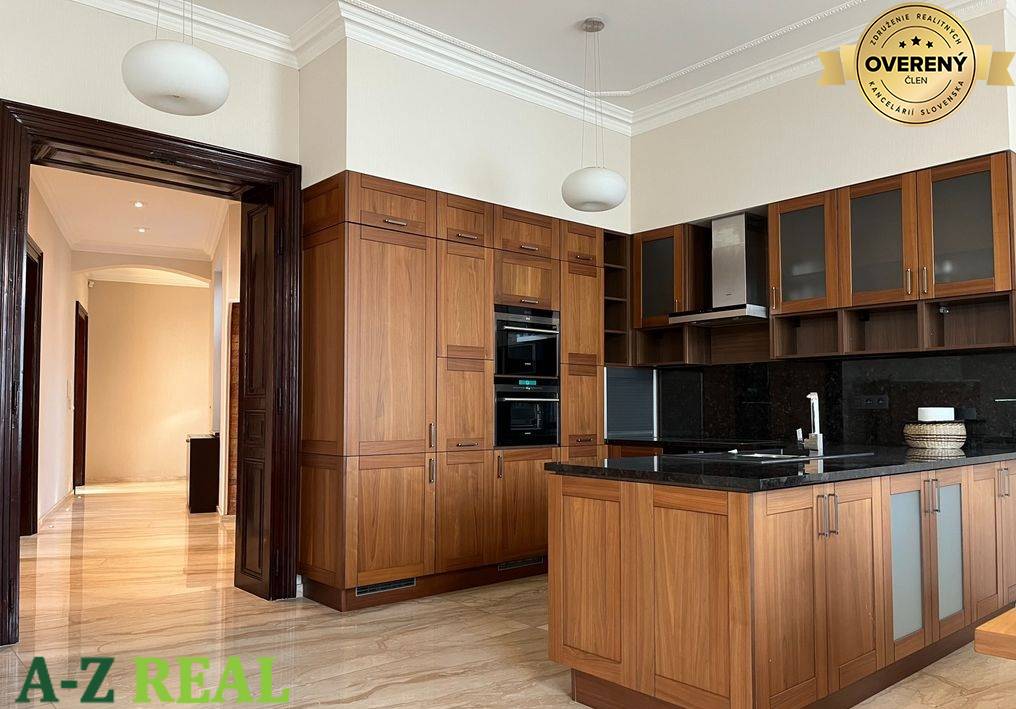 Hlavná kúpeľňa ponúka pravé kamenné obklady, priestranný sprchovací kút i voľne stojacu vaňu, presvetlené denným svetlom. Druhá kúpeľňa je čerstvo zrenovovaná s high-end dizajnovým vybavením. Drevená kuchyňa je vybavená spotrebičmi Siemens a dopĺňa ju priestranný jedálenský priestor pre 8 a viac ľudí, ktorý spája priestor s priestrannou obývacou izbou. Byt má vykurované sklenené átrium použiteľné ako zimná záhrada. K dispozícii je aj pivnica.