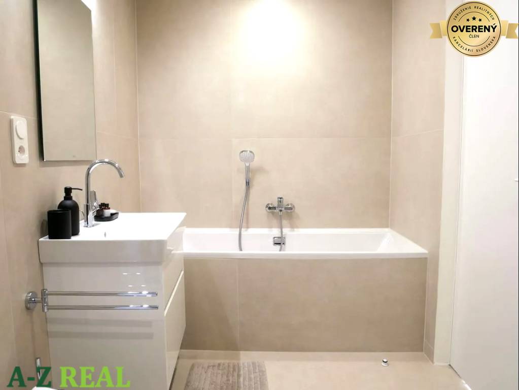 Apartmán je kompletne zariadený kvalitnými vstavanými spotrebičmi – elektrická rúra, mikrovlnná rúra, chladnička s mrazničkou, umývačka riadu a indukčný varný panel. Kuchynská časť je doplnená o praktický kuchynský ostrovček s barovým sedením a nadštandardný indukčný panel so vstavaným digestorom, ktorý dodáva priestoru moderný a čistý vzhľad. Celok harmonicky dopĺňa pracovná doska z prírodného kameňa. Samozrejmosťou je klimatizácia, Smart TV a spoľahlivé internetové pripojenie, ktoré je zahrnuté v cene prenájmu.