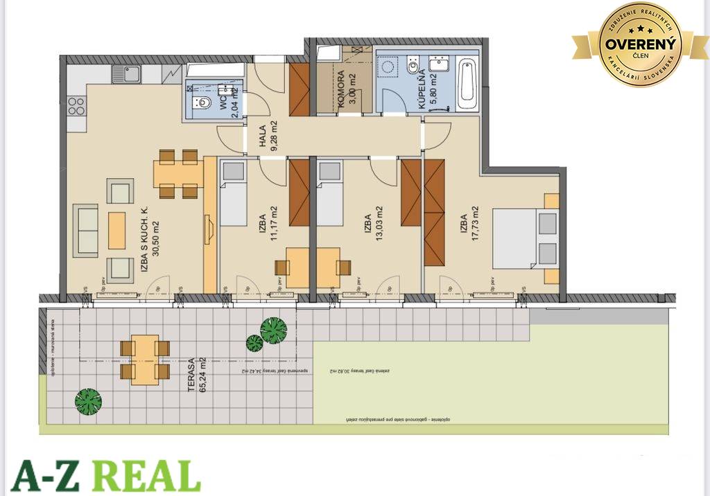 Dispozícia bytu pozostáva zo 4 obytných miestností, ktoré tvorí obývacia izba s kuchyňou, 3 spálne - každá so samostatným vstupom a výstupom do záhrady, priestranná kúpeľňa s vaňou a WC, samostatné WC a komora.